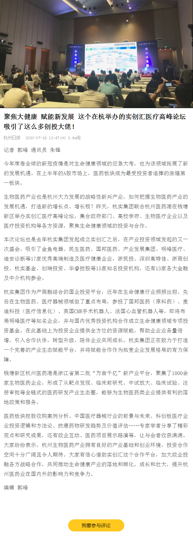 聚焦大健康 赋能新发展 这个在杭举办的实创汇医疗高峰论坛吸引了这么多创投大佬!