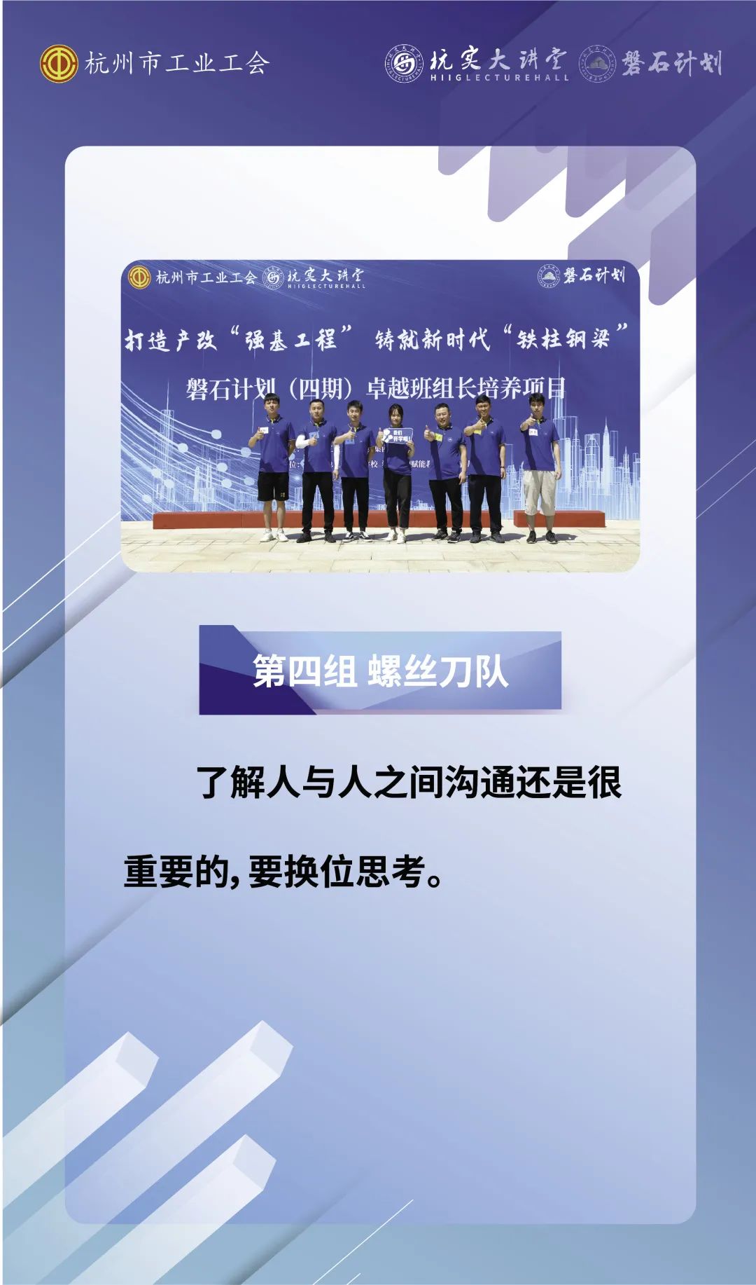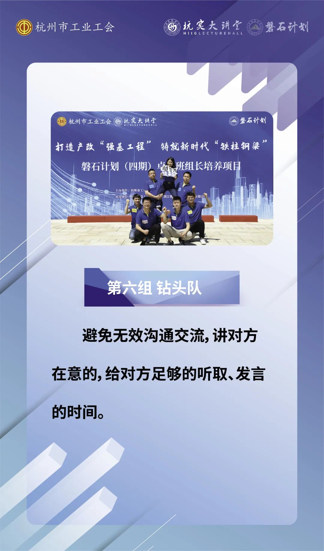 磐石计划(四期)卓越班组长培养项目历时两阶段30天,于8月6日顺利结项。来自32家基层单位的42名班组长在此次培训学习中积极吸收管理知识,相互沟通交流,共同成长,圆满结业。