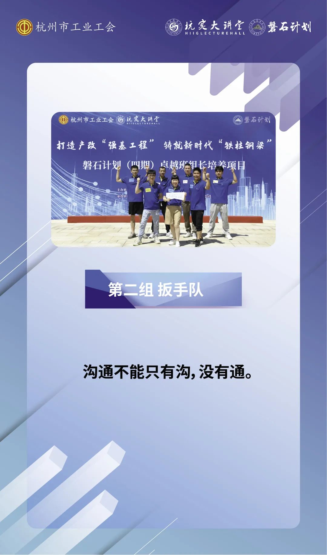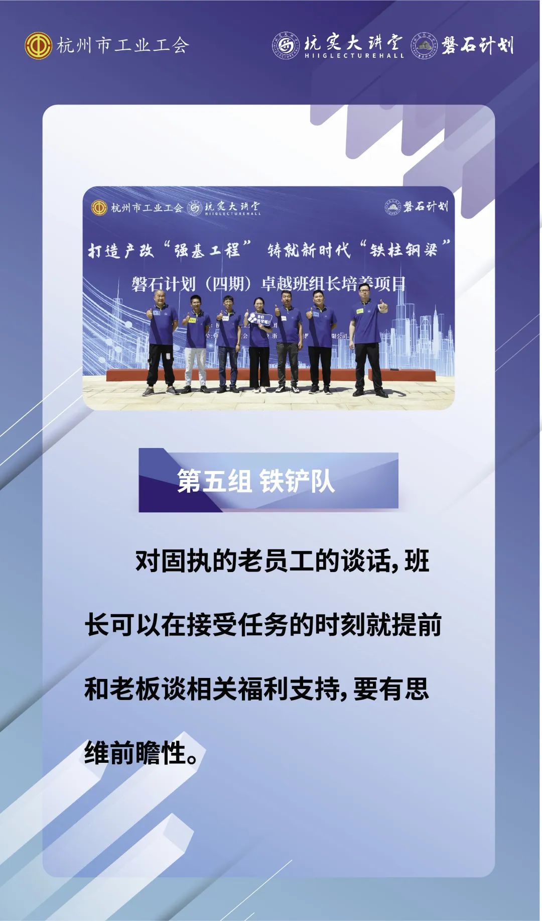 本次培养项目围绕“提升班组长综合素质”的核心理念,教学设计形式多样,包含破冰融入、歌曲合唱、学习参访、产改课程面授、高效沟通课程面授、《五型班组管理》课程面授、参观工运史馆、优秀案例分享、红色观影等环节,充分地调动了大家培训的积极性,实地体悟与理论学习并重,注重运用、训战结合。